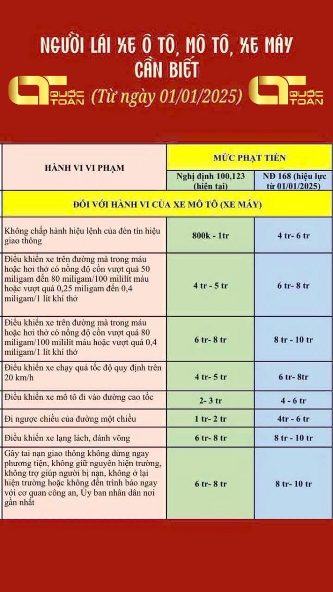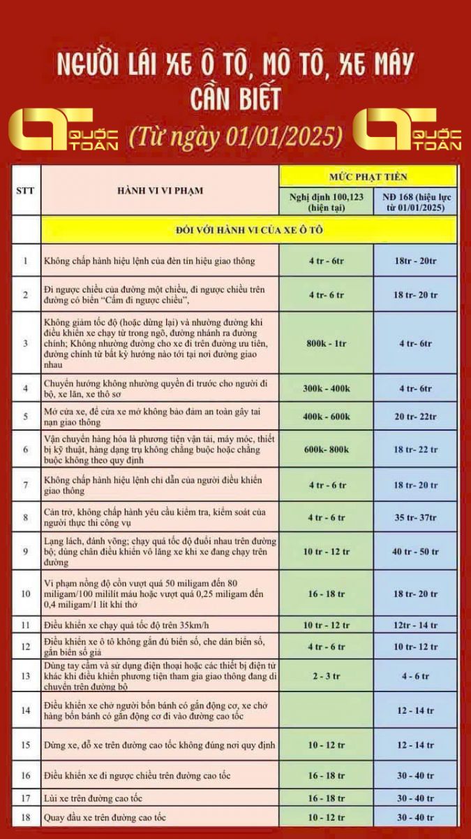 Từ ngày 1/1/2025, theo Nghị định 168, nhiều hành vi vi phạm giao thông sẽ bị tăng mức xử phạt đáng kể nhằm nâng cao ý thức chấp hành luật lệ và đảm bảo an toàn giao thông. Dưới đây là một số thay đổi quan trọng đối với người điều khiển ô tô và xe máy: